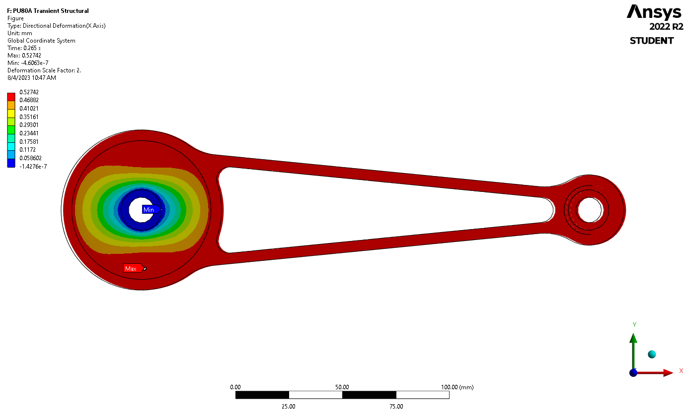 Transient Structural Analysis: Simulated engine torque pulses over time (~30 Hz) to assess dynamic load effects and bushing deformation under cyclic loading.